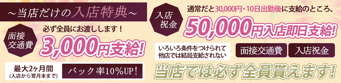 【入店祝金】30,000円 ※初出勤日に支給します。 【在籍3ヶ月】30,000円支給。 |